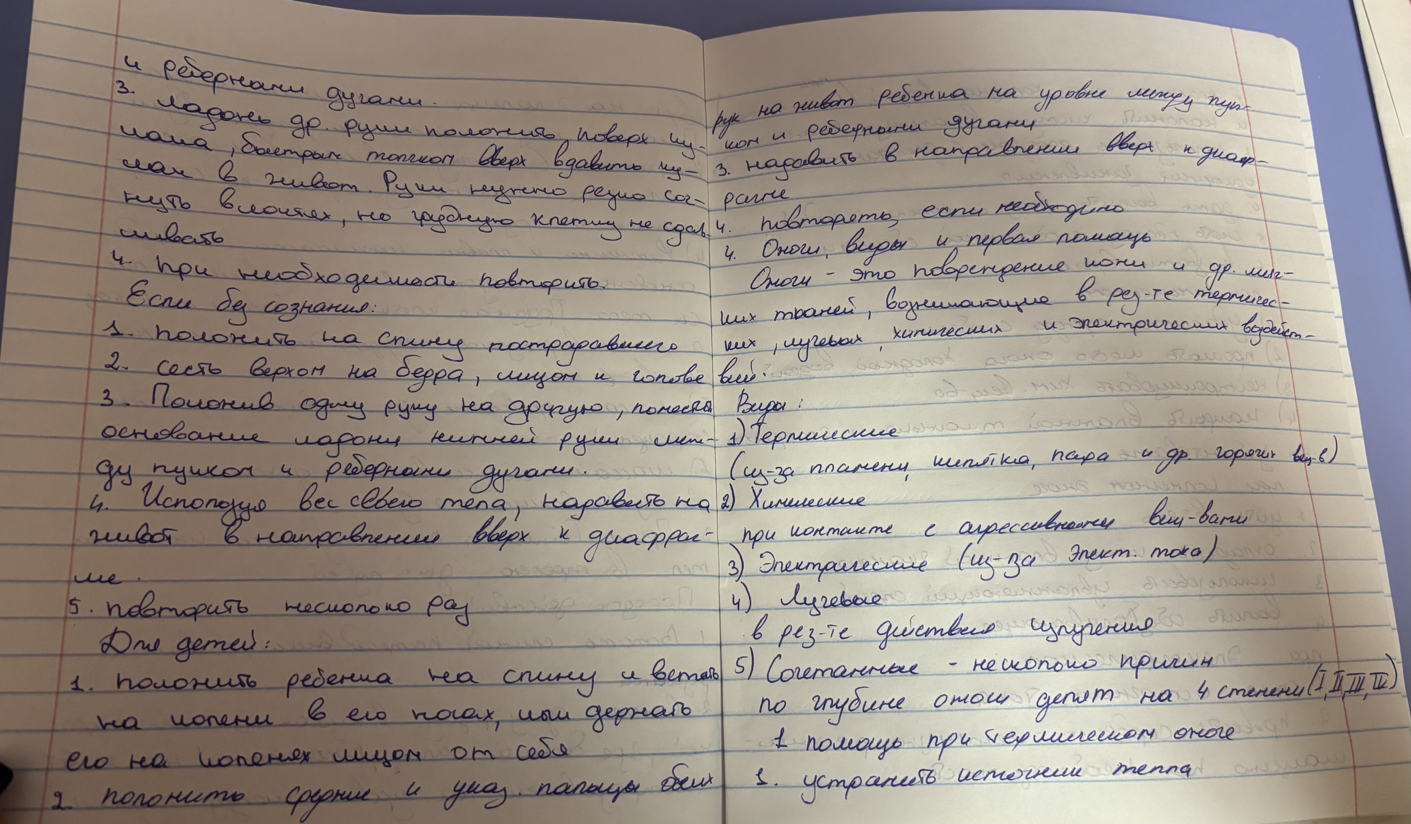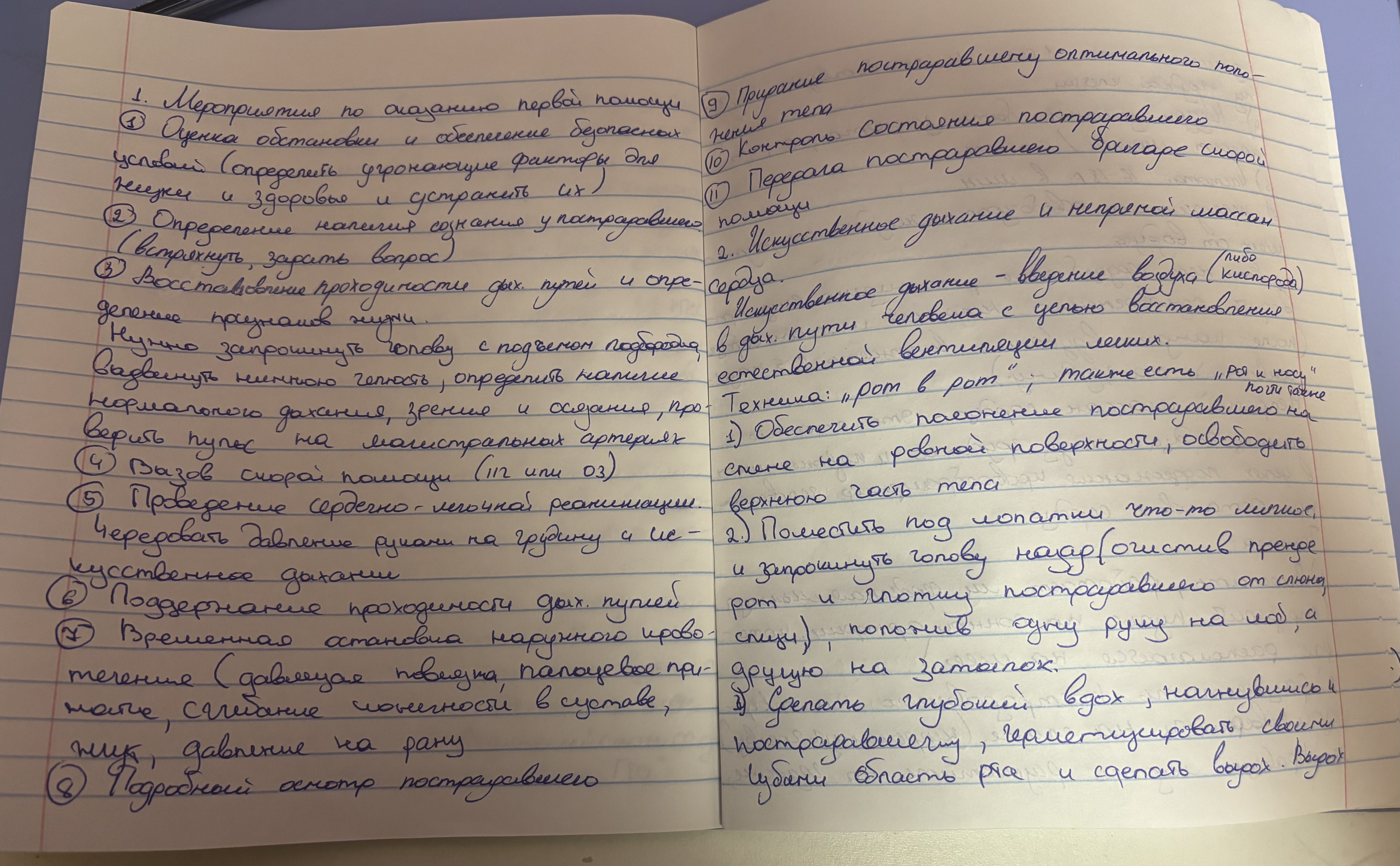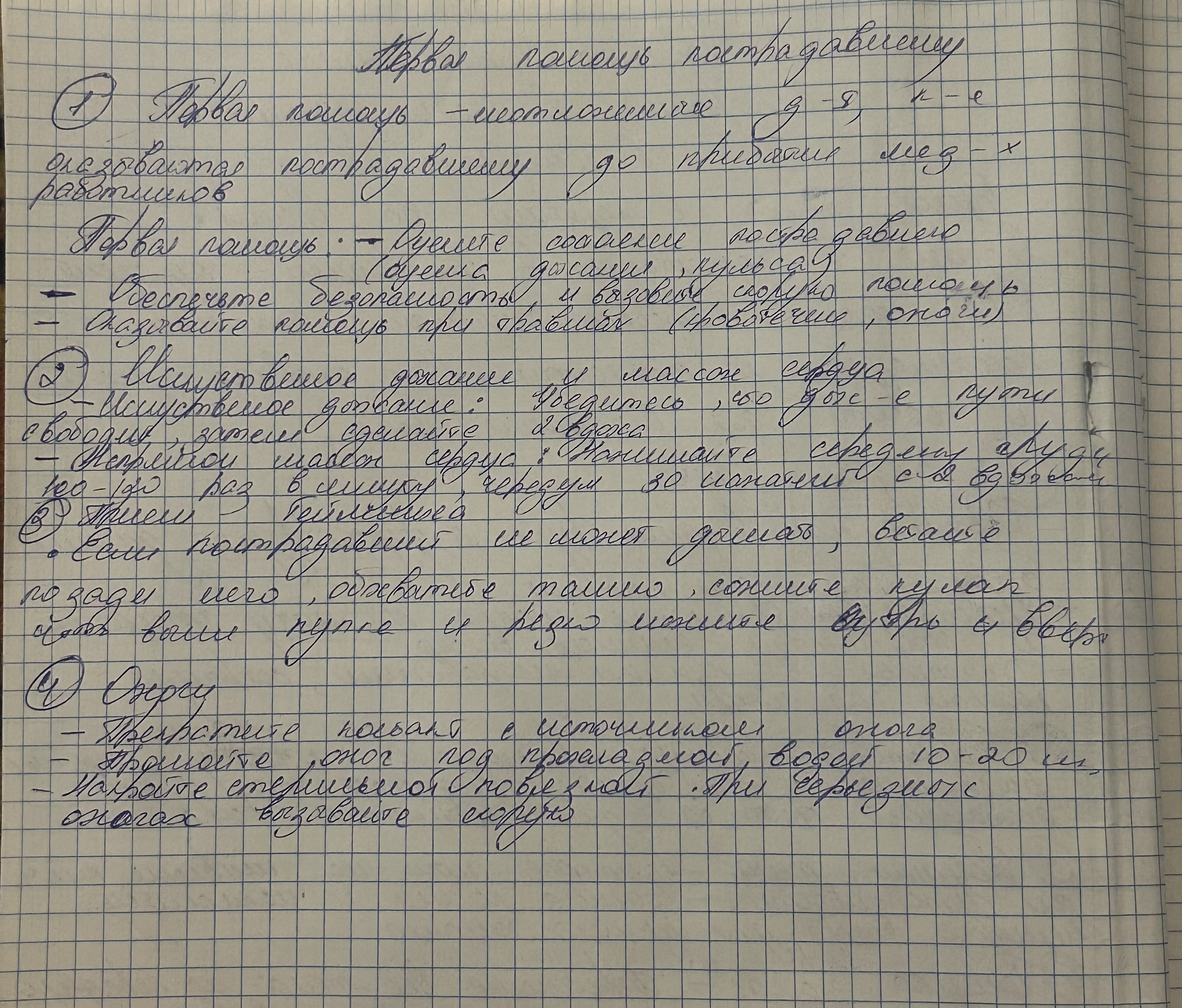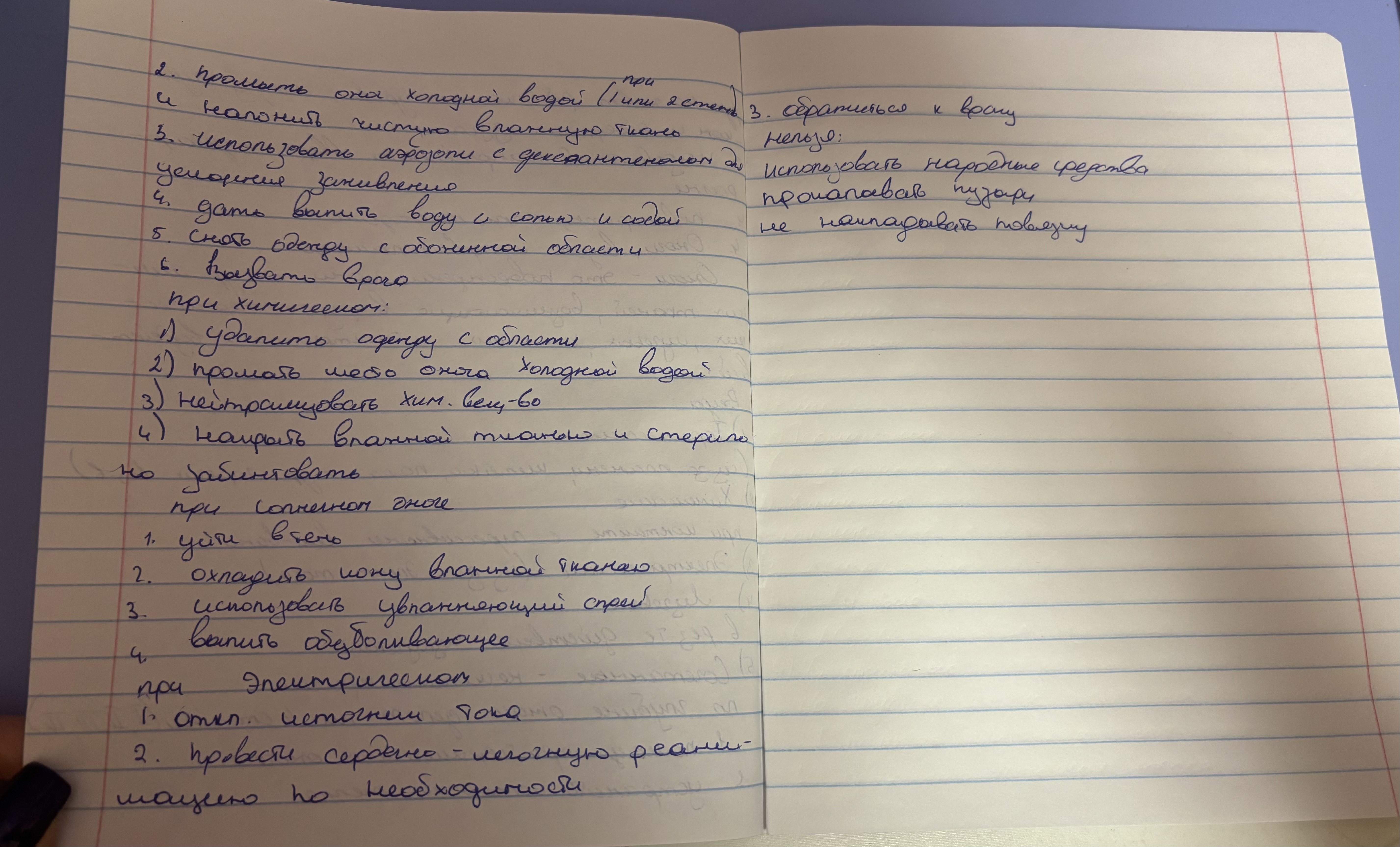 1.Мероприятия по оказанию первой помощи.2.Исскуственное дыхание и непрямой массаж сердца.3.Прием Геймлиха при попадании инородных тел в трахею дыхательных путей.4.Ожоги, первая помощь при ожогах.